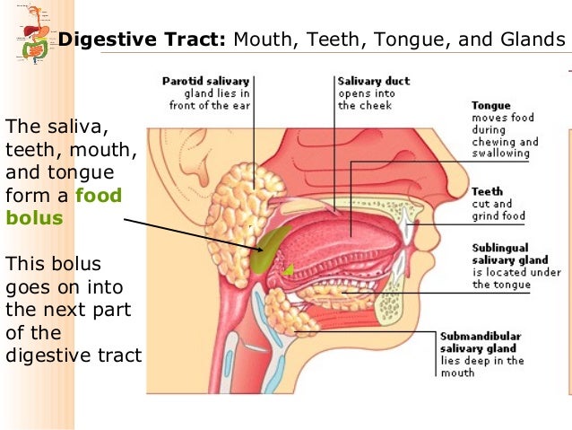 The process of digestion begins with the introduction of food into the mouth and ends with the excretion of waste from the anus. When food enters the mouth, the process of digestion begins; the teeth, tongue, roof of the mouth, lips, and cheeks work together to begin the mechanical breakdown of food where food is broken into pieces by the act of chewing; saliva mixes with the food beginning a chemical reaction, causing the food to form into a ball known as the bolus (Crash Course, 2012). From the mouth, the bolus is then pushed through the parts of the pharynx, located in the back of the throat, down the esophagus by a series of muscle contractions and into the stomach (Sizer & Whitney, 2017).